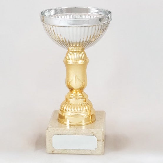 Hopeanvärinen kuppi on metallia, kullanvärinen varsiosa on muovia ja jalusta on marmoria.