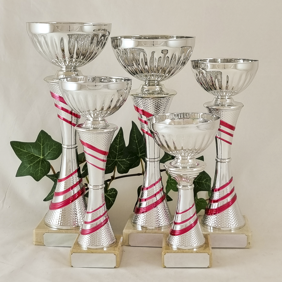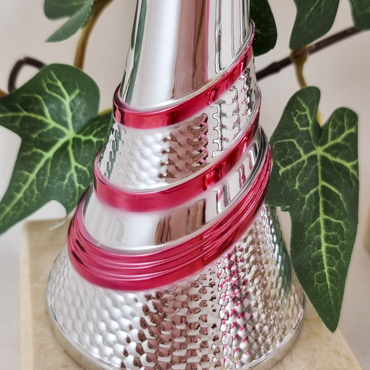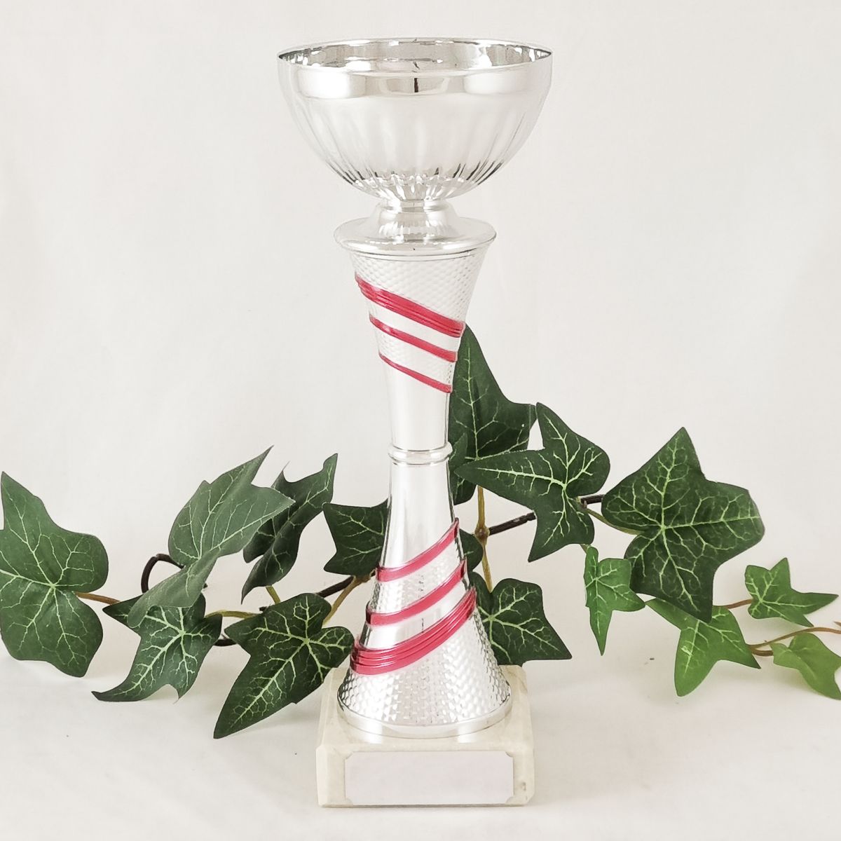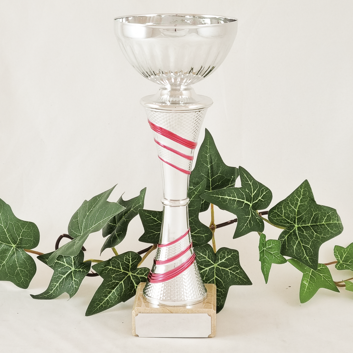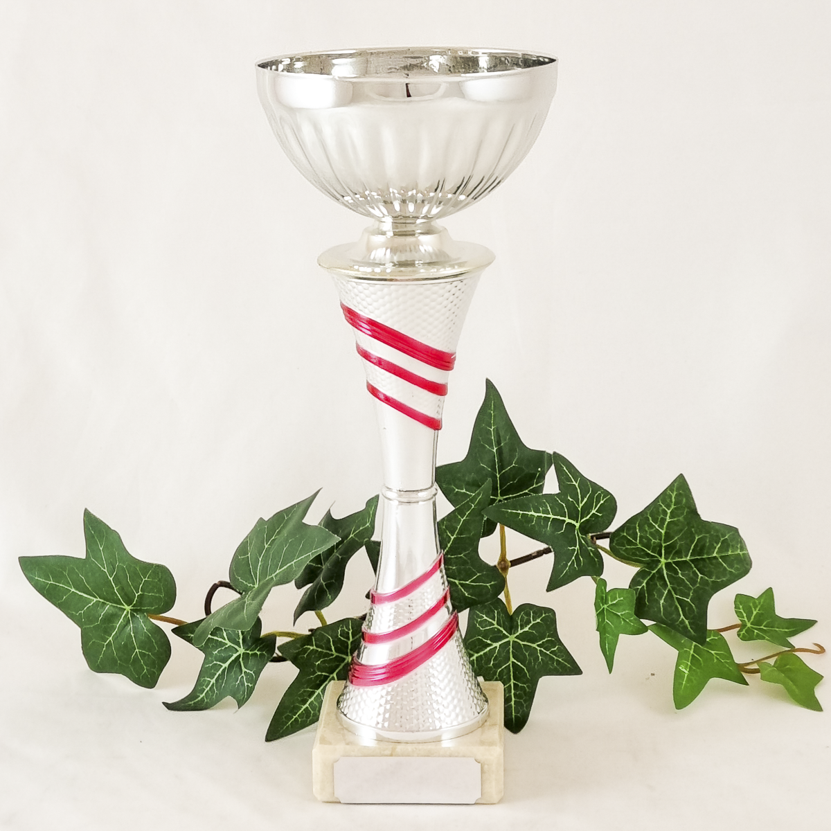 Hopeanvärinen kuppi on metallia, hopea-pinkki varsiosa on muovia ja jalusta on marmoria.